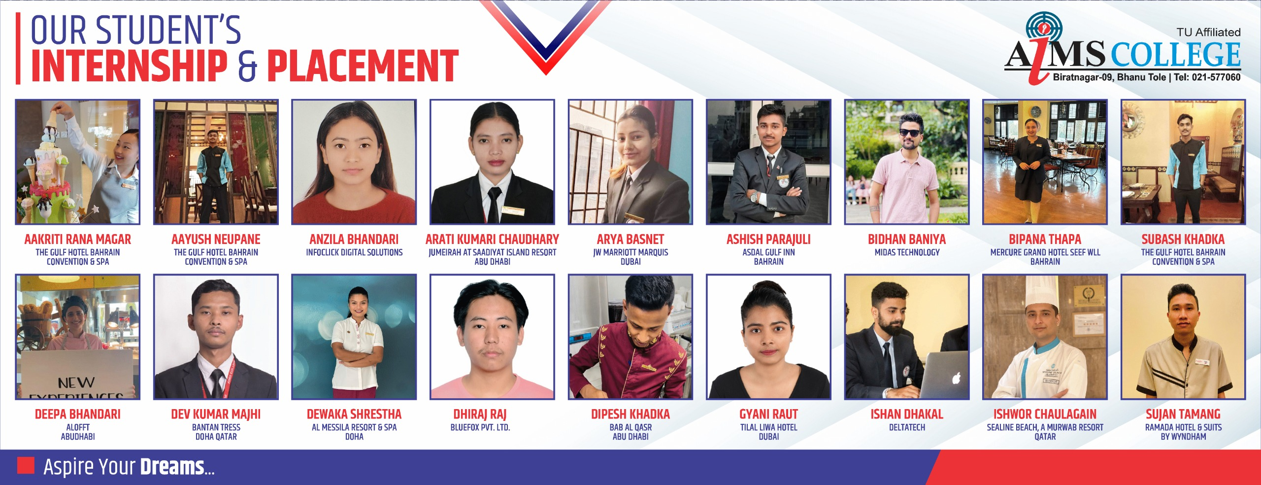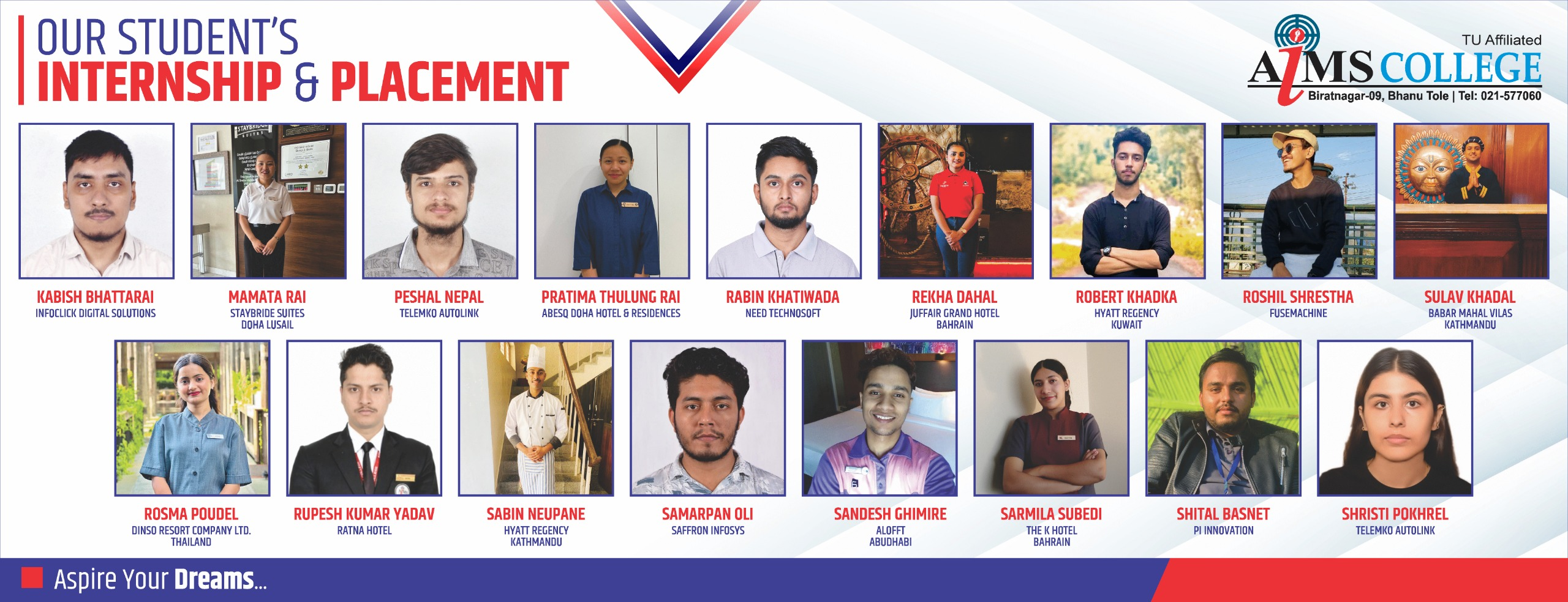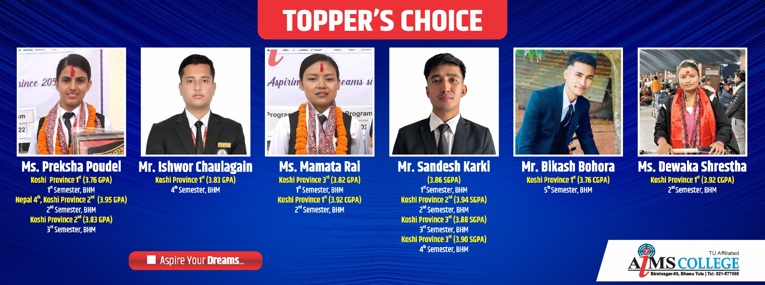 AIMS College is a symbol of discipline and learning, striving for excellence by providing education of global standards. As a leading academic institution in province no.1, our college stands out in terms of results and the skills students acquire during their time here. The college management, officials and students are united in the goal of elevating AIMS to the highest level of education. So, we believe your time at AIMS will be life-changing, intellectually stimulating, and career-enhancing, in a friendly and welcoming community. We are dedicated to helping you achieve your aspirations and reach your goals, and our motto "Aspire your dreams" is a constant reminder of this.